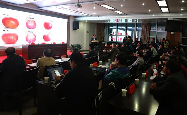 Professor Zhao introduces the breeding procedures of the two new apple varieties at the conference.