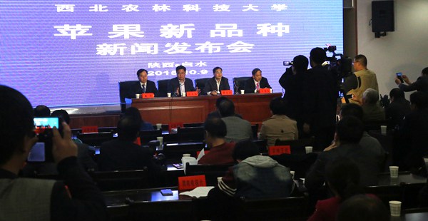On October 9th, 2015 the press conference of NWAFU’s new apple varieties “Rui Yang” and “Rui Xue” was held at Baishui County, Shaanxi Province. Over 20 media including Xinhua News Agency, People’s Daily, Guangming Daily, CCTV 7 and other central and provincial media reporters, as well as related experts, leaders and guests attended the conference.